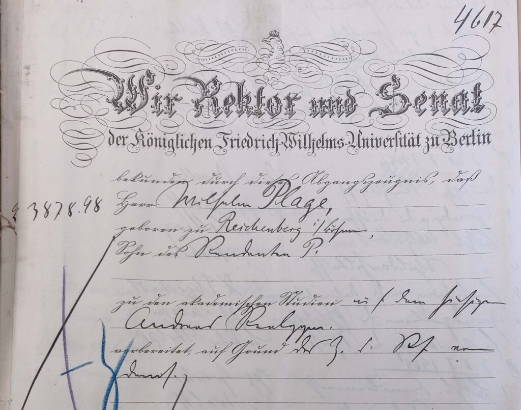 さて、ドイツに残されたさまざまな資料のなかでプラーゲの名前を最初に確認できるのは、フンボルト大学の学籍登録の書類においてである。これはベルリンにいくつかある資料館のなかのひとつ、当然ではあるがフンボルト大学のアルヒーフのなかに含まれている。それによると、1908年4月24日に学生登録は行われ、プラーゲは1910年の夏学期まで法学生として在学していたことが分かる。