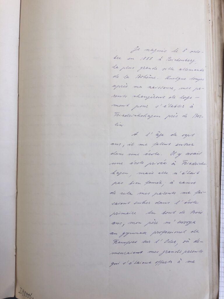 人物編のP1 11.277の資料はヴィルヘルム・プラーゲについてだけの冊子体であり、プラーゲに関して残されたもっとも大きな資料であるが、このなかに通訳として日本に赴任する目的で書かれたと思われるプラーゲ自身の来歴を示した文章を読むことができるのである。これは外務省に宛てた自己紹介のようで、英語はともかく、フランス語の方がなにゆえ書かれたのかは不明であるが、おそらくは言語能力を示すためなのだろう。いずれにしても流暢なフランス語で、すでに母国語のほかに日本語、英語、フランス語を駆使できる通訳としてのプラーゲの具体的な姿がようやく見えてくる。