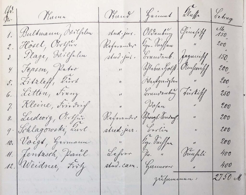 これを見ても法学生であったプラーゲの成績は優秀だったようで(履修科目は分かったが、成績証明署の類は残念ながら発見できなかった)、同じ大学内の別組織であった東洋言語ゼミナルへの参加に際しても、期待されている様子が偲ばれよう(上記の表では、プラーゲの欄の右端に150の数字が見える)。