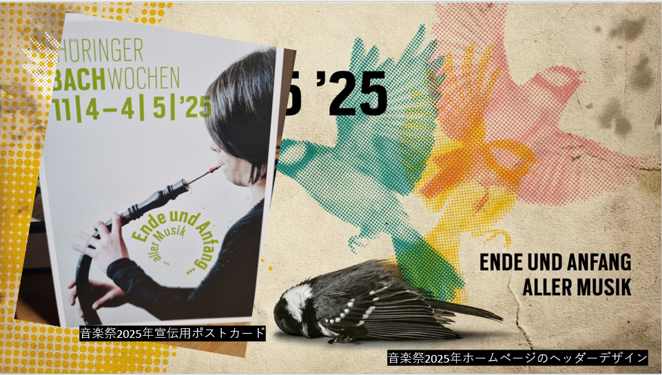 今年のもう一つの核は„Lange Nacht der Musik”と発表された。そこでは地元住民であれば誰でもTBWの公演を主催でき、すでに毎年恒例の行事となっているが、新インテンダントのヒンリヒスによりその意義が再評価され、重点化された。今年はルターの宗教改革に端を発するドイツ農民戦争500周年とのコラボ企画や、テューリンゲン出身でオランダに移住した音楽家の作品など、地域性を前面に出したプログラムも多い。重要なのは、テューリンゲンを故郷とするバッハということだけでなく、そこに国家や時代を超えた他文化との接点が見出せることだろう。上記公演は、ルターを媒介として、ドイツにおける過去と現在、オランダとテューリンゲンとの音楽文化の連関、さらには東洋思想との接点までも見出せる。例えばイースターには、バッハが活躍したヴァイマル居城の庭を、ゲーテ時代のように散歩しながら音楽を楽しむ、というイベントがあった。ゲーテの思想、魂の輪廻 Seelenwanderung に寄り添って読み解くならば、音楽祭2025年のプログラム冊子やウェブサイトのヘッダー、ならびに宣伝用ポストカード(画像5)に描かれたモチーフ――鳥の生と死、そしてオーボエ・ダ・カッチャの丸みと調和する草色で書かれた今年のモットー„Ende und Anfang aller Musik”の螺旋状のデザイン――は、自然の摂理としての冬と春の循環、さらにはバッハの教会音楽における死と生、受難と復活の循環を象徴するものと解釈できる。直線状に進む「進歩主義」ではなく「輪廻」の世界観だ。東洋思想に共鳴したゲーテを介して、バッハの音楽は日本とも対話の扉を開く。